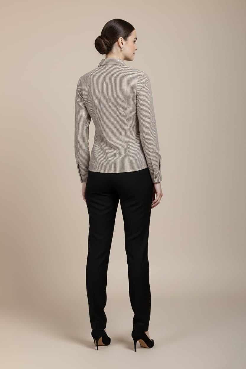 Elevate your workwear wardrobe with this elegant brown striped formal shirt.Designed with a refined ruched placket,classic collar,and long sleeves |