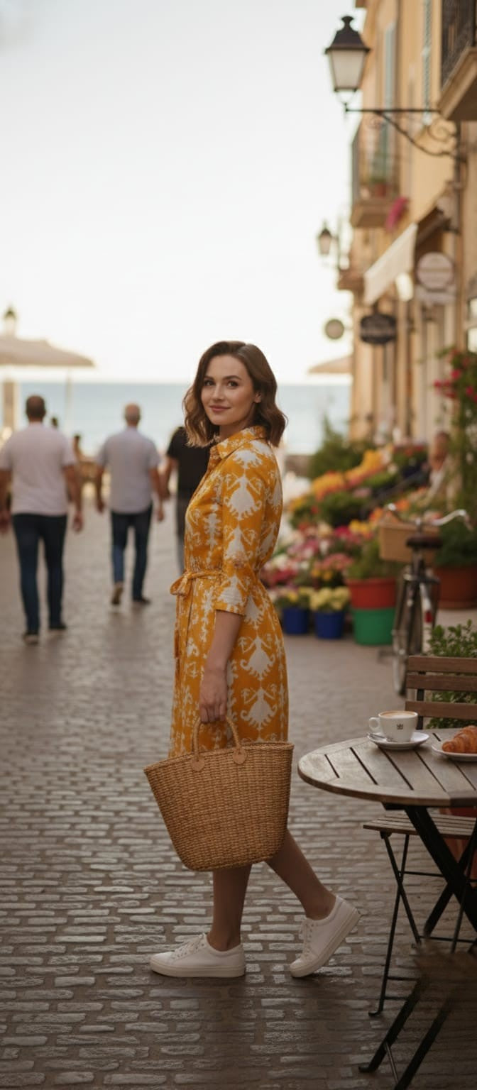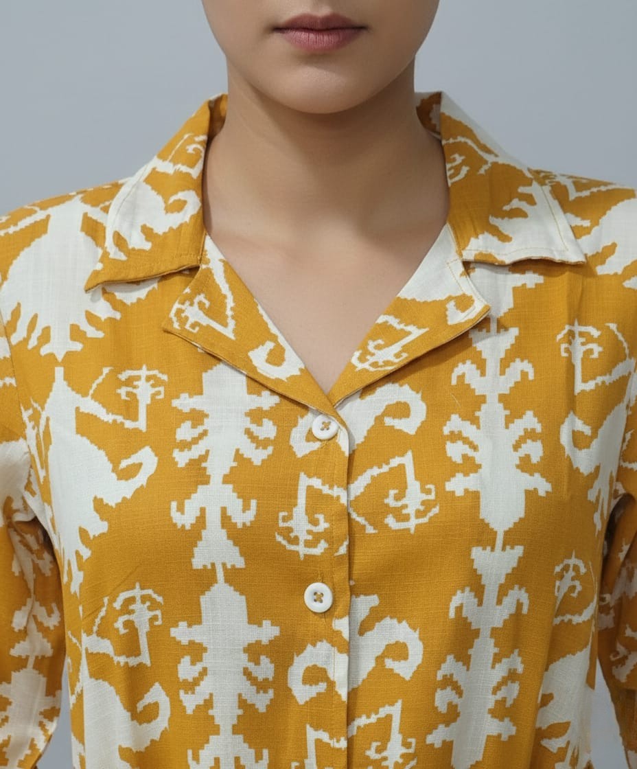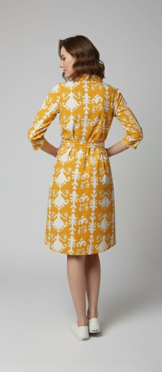 This mustard ikat-printed shirt dress,featuring a relaxed silhouette, soft fabric and a tie-up waist belt that flatters every body type.Designed with 3/4th sleeves,collared neckline and button-down front |