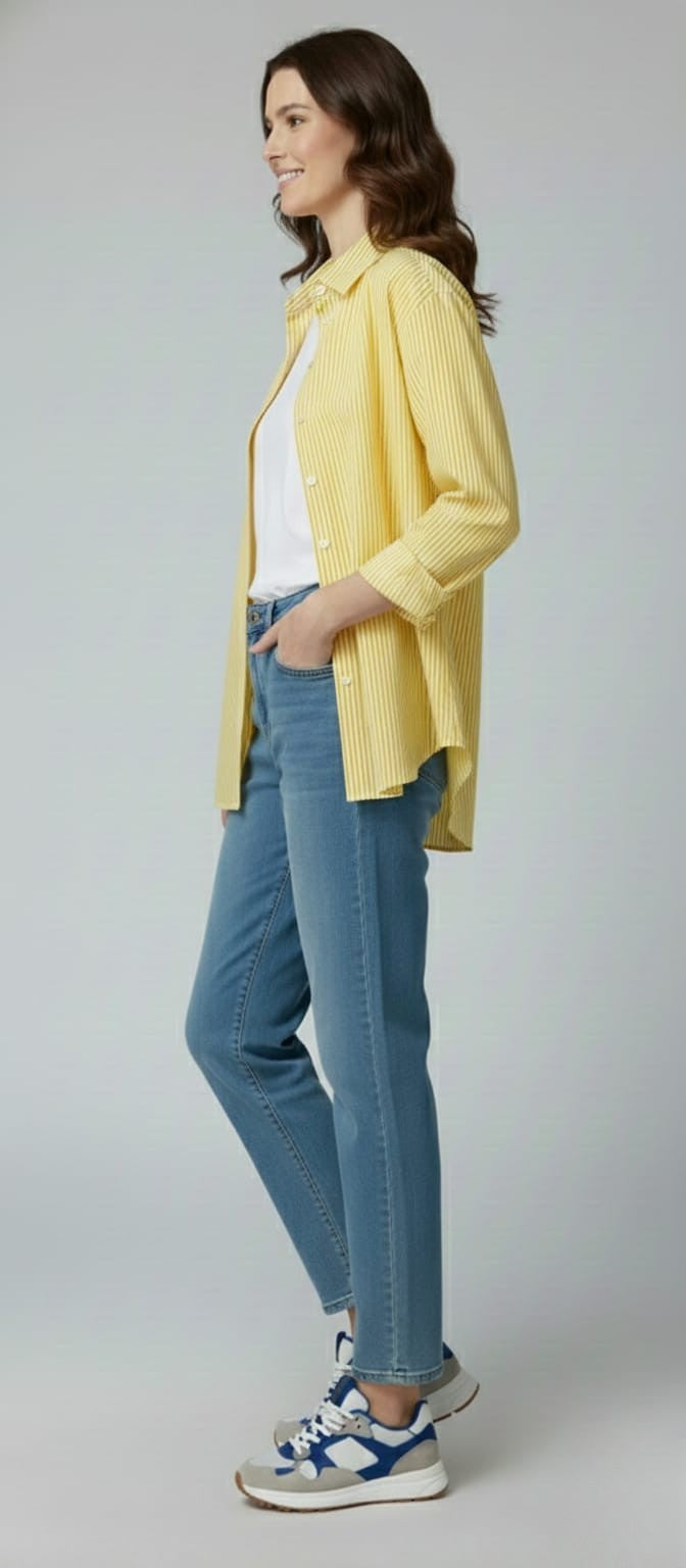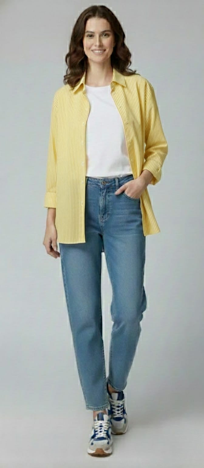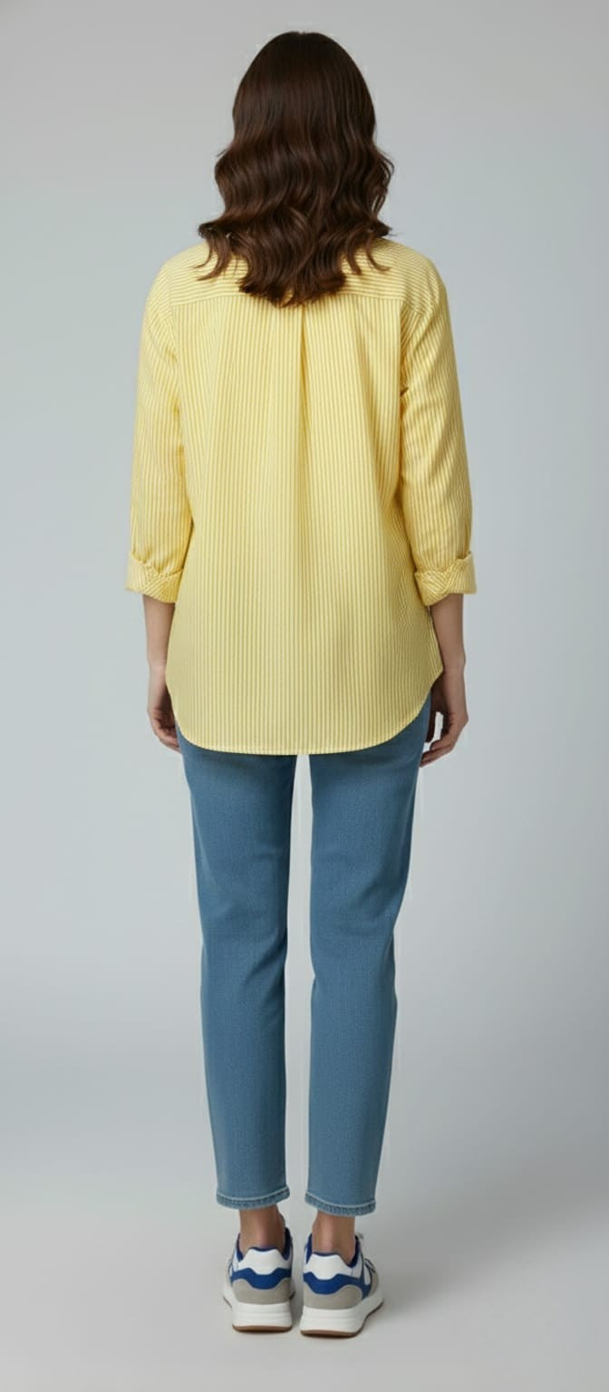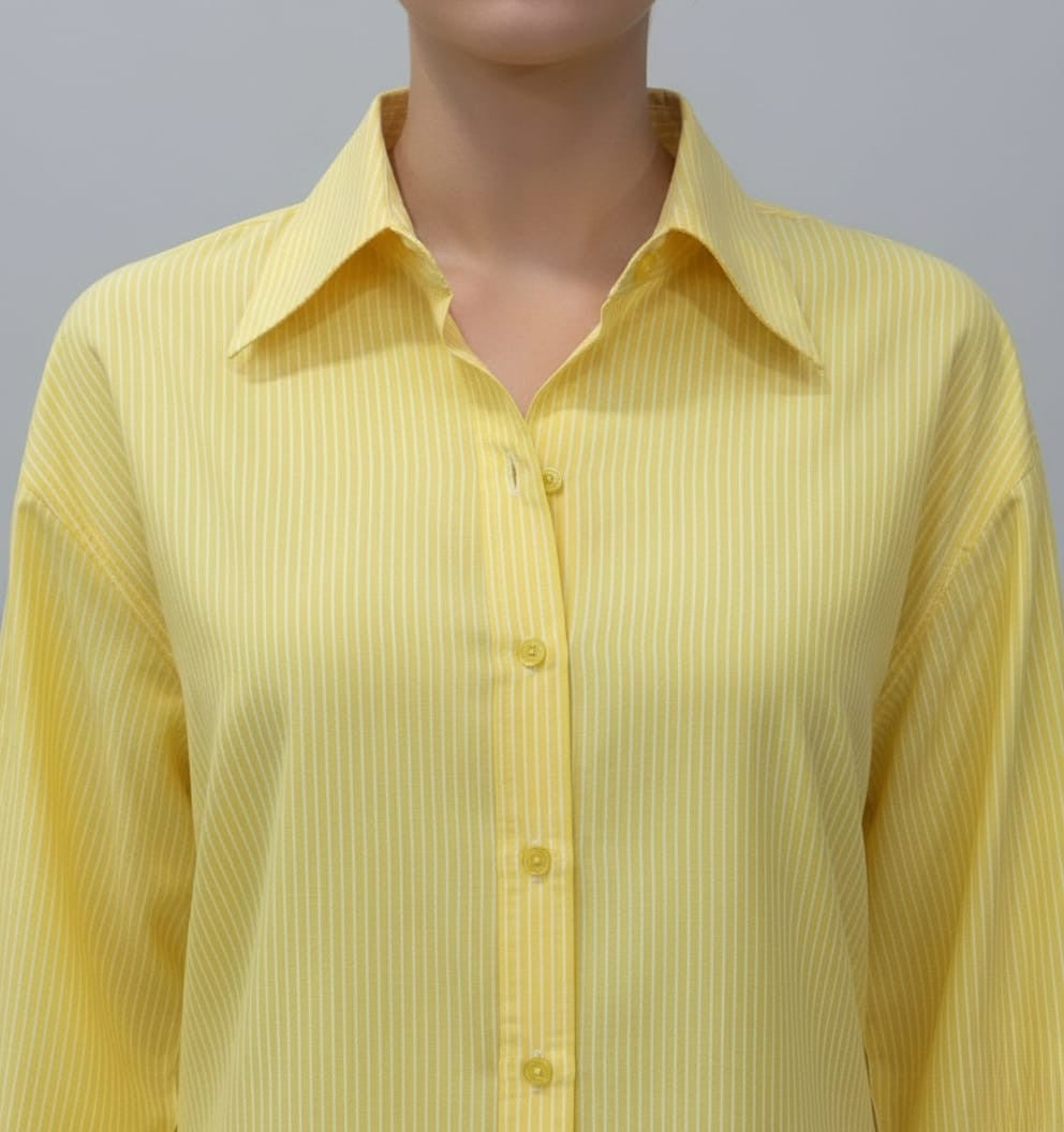 This yellow striped oversized shirt,designed for a relaxed yet polished look.Crafted from a smooth, comfortable fabric,it features fine vertical stripes,a classic collar,long sleeves with buttoned cuffs,and a curved hem for easy styling. |