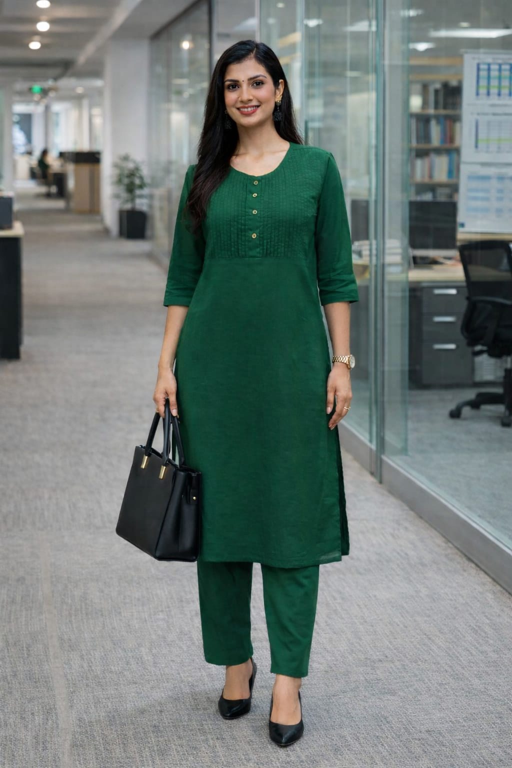 Elevate your everyday style with this bottle green straight kurta set.Featuring a beautifully pintucked yoke, wooden button detailing and a sleek straight silhouette.Paired with matching straight pants featuring an elasticated waist and side 2 pockets. |